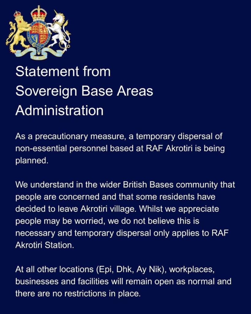 Σύμφωνα με επίσημη δήλωση της Sovereign Base Areas Administration, το μέτρο εντάσσεται σε προληπτικό σχεδιασμό και αφορά αποκλειστικά τον σταθμό της RAF στο Ακρωτήρι. Δεν πρόκειται για γενικευμένη εκκένωση ούτε για μέτρο που επεκτείνεται σε άλλες εγκαταστάσεις των Βρετανικών Βάσεων.