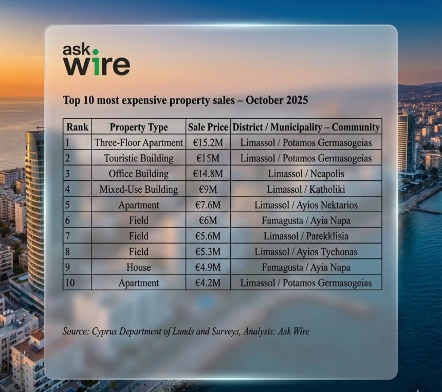 Η Ask Wire, εταιρεία που βασίζεται στην τεχνολογία για να παρακολουθεί συναλλαγές, ζητούμενες τιμές και την κατασκευαστική δραστηριότητα στον τομέα των ακινήτων, επεξεργάστηκε και δημοσιεύει τα στοιχεία για τις 10 ακριβότερες πράξεις πώλησης ακινήτων που ολοκληρώθηκαν τον Οκτώβριο του 2025 και τη συνολική αξία των 10 ακριβότερων πωλήσεων ανά επαρχία.
