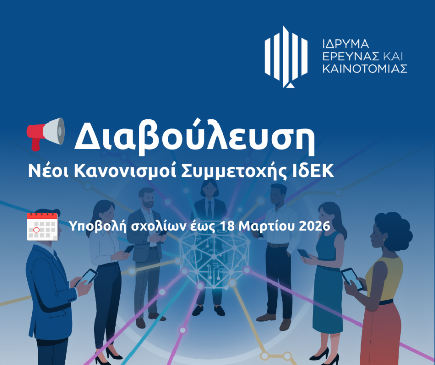 Το Ίδρυμα Έρευνας και Καινοτομίας (ΙδΕΚ) ανακοινώνει την έναρξη διαβούλευσης για τους νέους Κανονισμούς Συμμετοχής στα χρηματοδοτικά του Προγράμματα.