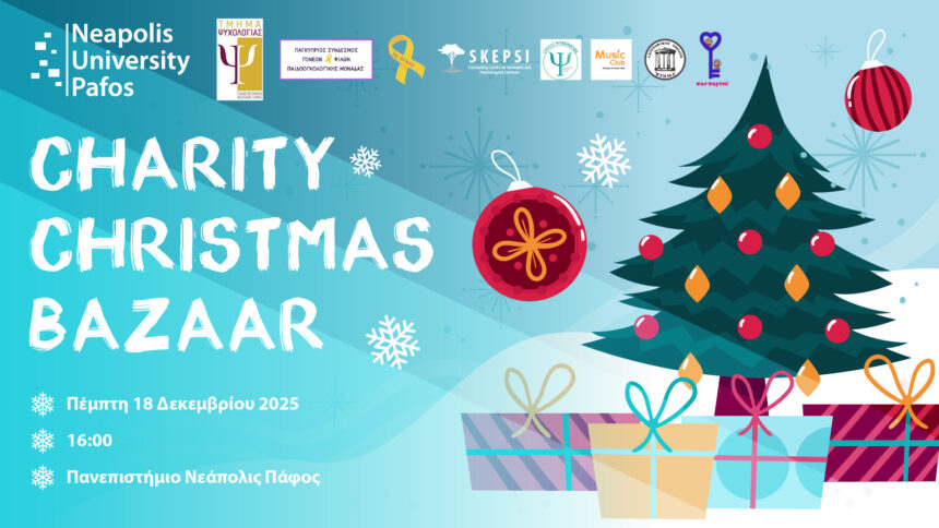 Το Τμήμα Ψυχολογίας του Πανεπιστημίου Νεάπολις Πάφος, σε συνεργασία με τον Παγκύπριο Σύνδεσμο Γονέων και Φίλων Παιδοογκολογικής Μονάδας, διοργανώνει φιλανθρωπική χριστουγεννιάτικη εκδήλωση με στόχο την ενίσχυση της κοινωνικής αλληλεγγύης και τη στήριξη παιδιών που δίνουν τη δική τους μάχη. Η εκδήλωση θα πραγματοποιηθεί την Πέμπτη, 18 Δεκεμβρίου 2025, από τις 16:00 έως τις 19:00, στις εγκαταστάσεις του Πανεπιστημίου Νεάπολις Πάφος.