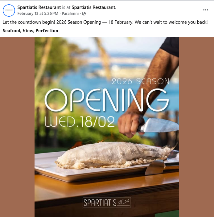 Η επανεκκίνηση μιας τουριστικής επιχείρησης δεν είναι απλώς μια ημερομηνία στο ημερολόγιο. Είναι δείκτης εμπιστοσύνης στην αγορά, στην τουριστική ροή και στη δυναμική της περιοχής. Το Spartiatīs Restaurant στο Παραλίμνι ανακοίνωσε το άνοιγμα της σεζόν 2026 για την Τετάρτη 18 Φεβρουαρίου, στέλνοντας σαφές μήνυμα: η νέα χρονιά ξεκινά νωρίς και με στρατηγική στόχευση.