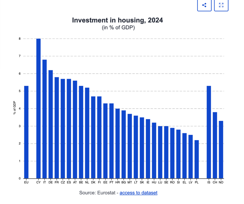 Σε ευρωπαϊκό επίπεδο, η οικοδομική δραστηριότητα παραμένει αυξημένη. Μεταξύ 2010 και 2024, οι οικοδομικές άδειες για κατοικίες αυξήθηκαν κατά 5%, ενώ οι επενδύσεις στη στέγαση έφτασαν το 5,3% του ΑΕΠ στην ΕΕ. Η Κύπρος καταγράφει ακόμη υψηλότερο ποσοστό, με επενδύσεις που αγγίζουν το 8% του ΑΕΠ.