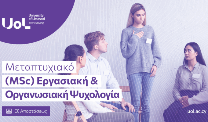 Το Πανεπιστήμιο Λεμεσού (UoL) ανακοινώνει την έναρξη εγγραφών για το μεταπτυχιακό πρόγραμμα MSc Εργασιακή & Οργανωσιακή Ψυχολογία (εξ αποστάσεως, γλώσσα: ελληνικά). Το πρόγραμμα εστιάζει στην εφαρμογή επιστημονικά τεκμηριωμένων ψυχολογικών αρχών για την ευημερία των εργαζομένων, τη βελτίωση της απόδοσης και τη συνολική οργανωσιακή αποτελεσματικότητα.
