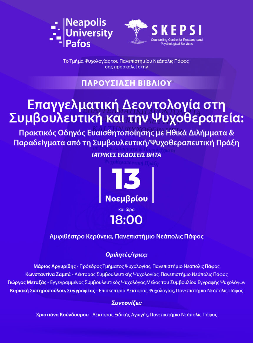 Το Τμήμα Ψυχολογίας του Πανεπιστημίου Νεάπολις Πάφος διοργανώνει την παρουσίαση του νέου βιβλίου της Κυριακής Σωτηροπούλου, Επισκέπτριας Λέκτορα Ψυχολογίας, με τίτλο: