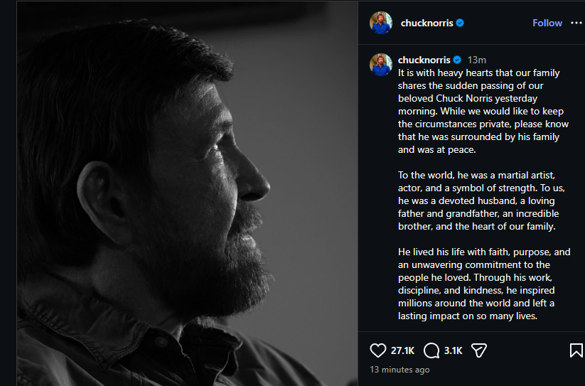 Την Παρασκευή 20 Μαρτίου ανακοινώθηκε πως έφυγε από τη ζωή ο Τσακ Νόρις. Η είδηση ανακοινώθηκε με μία ανάρτηση της οικογένειάς του στο επίσημο προφίλ του στο Instagram.
