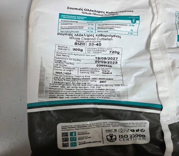 - Ονομασία Τροφίμου : Σουπιές Ολόκληρες Καθαρισμένες (Κατεψυγμένα)