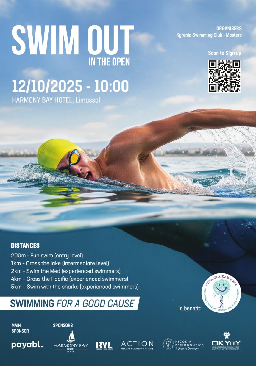Το «Swim Out in the Open», η ετήσια φιλανθρωπική κολυμβητική διοργάνωση του Ναυτικού Ομίλου Κερύνειας (κατηγορία Masters), επιστρέφει για συνεχή χρονιά, φέρνοντας και φέτος το μήνυμα της προσφοράς μέσα από τον αθλητισμό. Η διοργάνωση θα πραγματοποιηθεί την Κυριακή, 12 Οκτωβρίου, στις 10:00, στο Harmony Bay Hotel στη Λεμεσό.