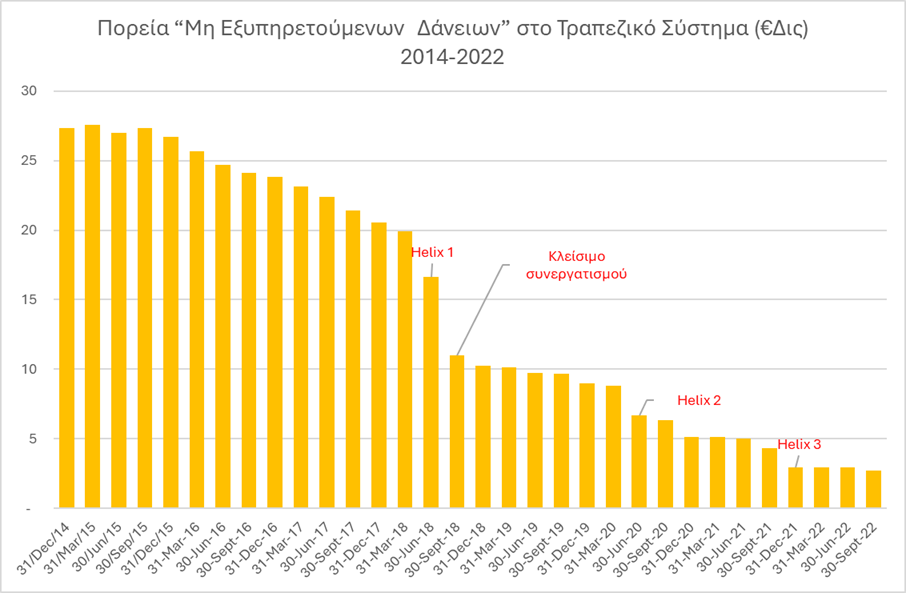 Επισημαίνουμε ότι από την μείωση των προβληματικών δάνειων κατά €24,6 δισ. στην περίοδο 31-Δεκ-14 έως στις 30-Σεμπ-22, €5,6 δισ. οφείλεται στο κλείσιμο του Συνεργατισμού, και €7 δις στην πώληση προβληματικών δανείων από την Τράπεζα Κύπρου σε μη-τραπεζικές εταιρίες διαχείρισης προβληματικών δανείων (Helix 1,2,&3). Δηλαδή πέραν της μισής μείωσης ήταν το αποτέλεσμα της ανάληψης προβληματικών δανείων από οργανισμούς εκτός του τραπεζικού τομέα με πολύ ψηλά ποσοστά από αυτά να εξακολουθούν να είναι προβληματικά