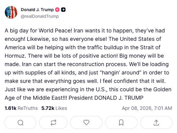 Σε μια δήλωση με έντονο πολιτικό και οικονομικό φορτίο, ο Ντόναλντ Τραμπ έκανε λόγο για «μεγάλη μέρα για την παγκόσμια ειρήνη», αφήνοντας να εννοηθεί ότι διαμορφώνονται προϋποθέσεις αποκλιμάκωσης στην ένταση με το Ιράν.